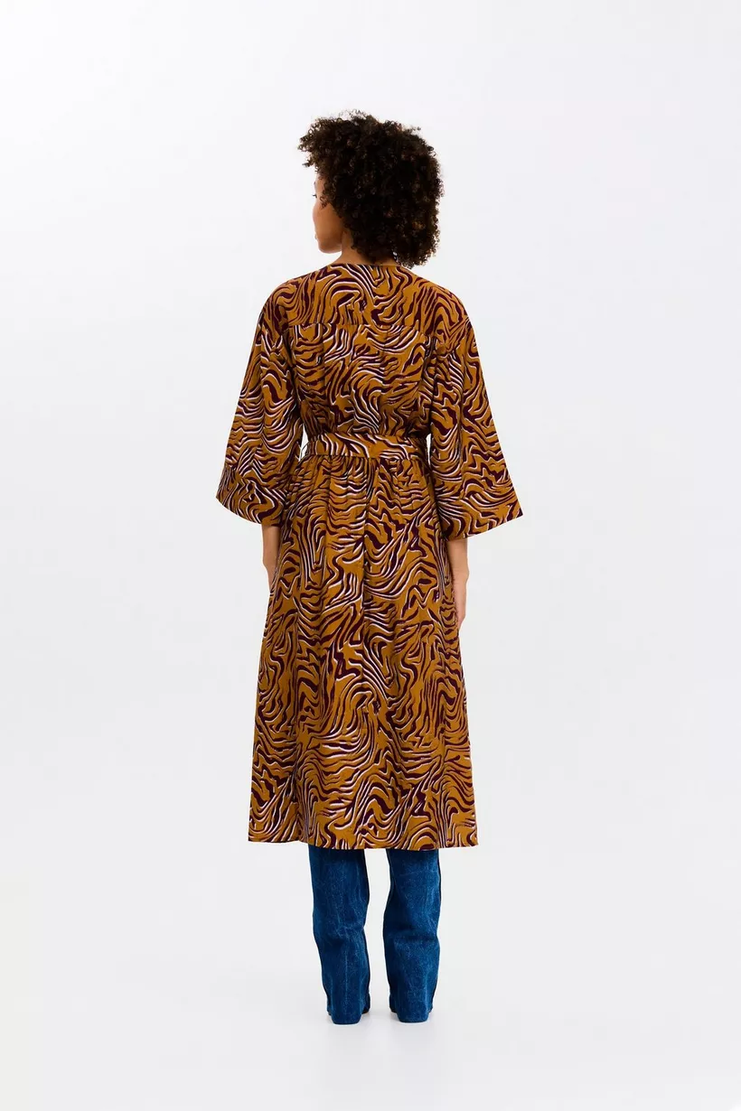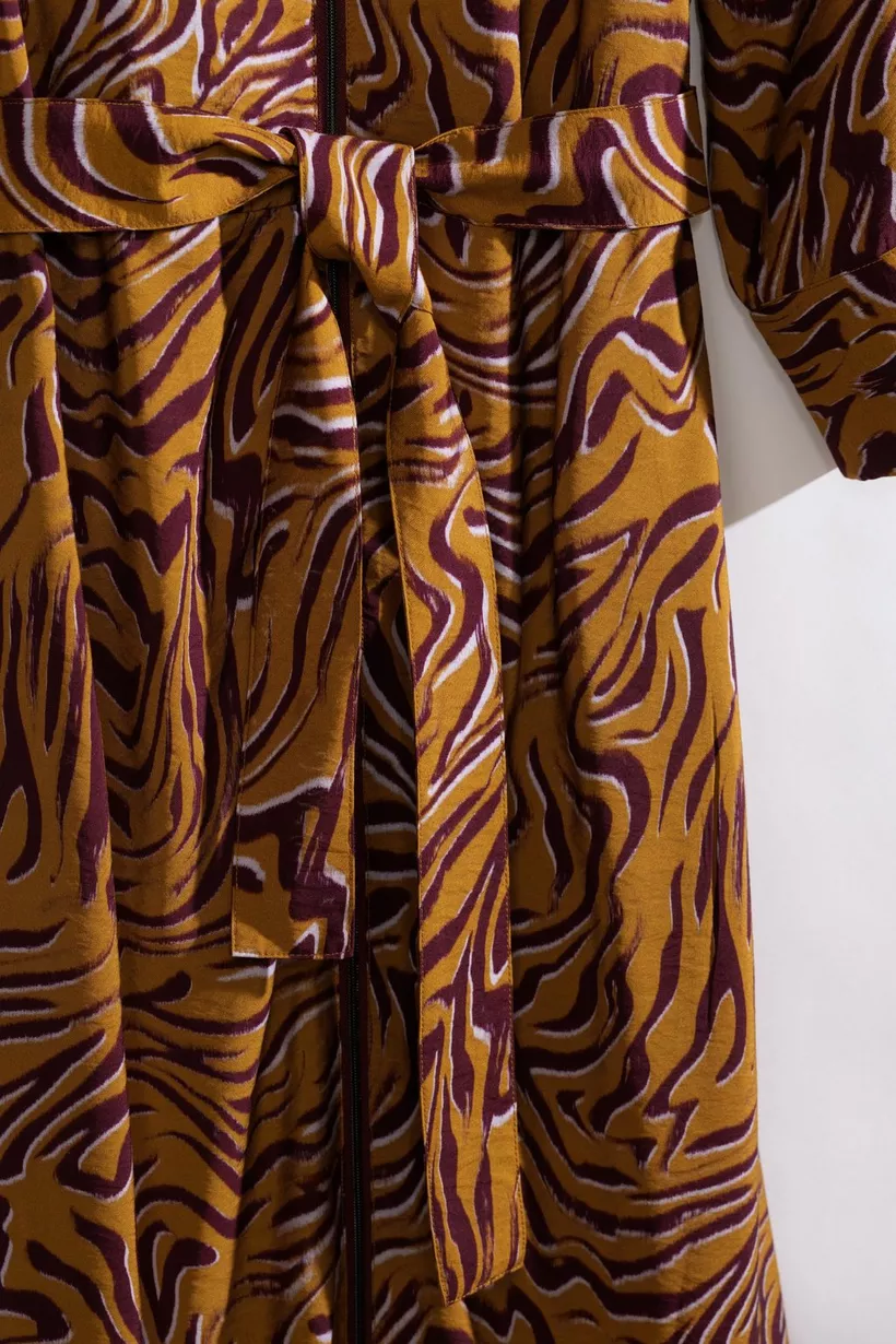 Unleash your inner nature met deze okerkleurige midi-jurk voor dames in een bordeaux zebraprint. Ga voor de animal print en draag dit item zowel naar kantoor als voor een etentje. Dit kleed heeft halflange mouwen, een rits en een lint om je taille te benadrukken.