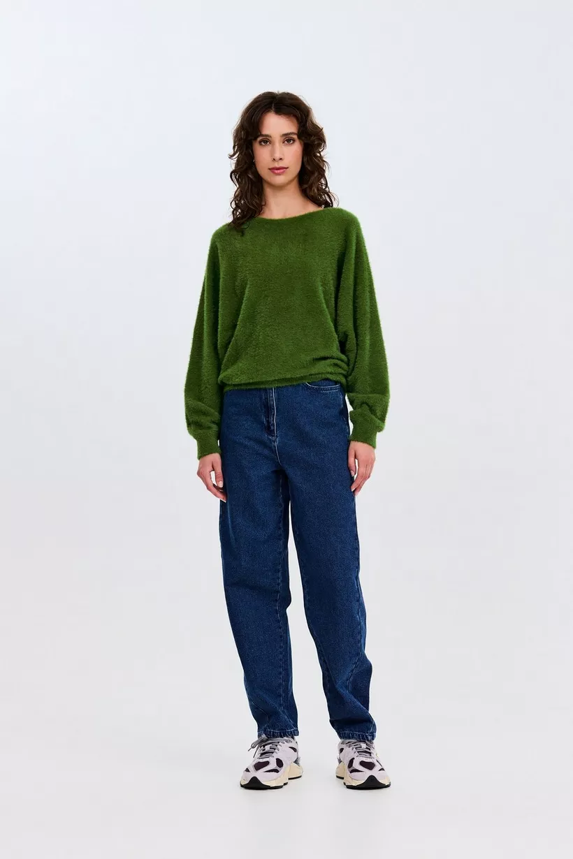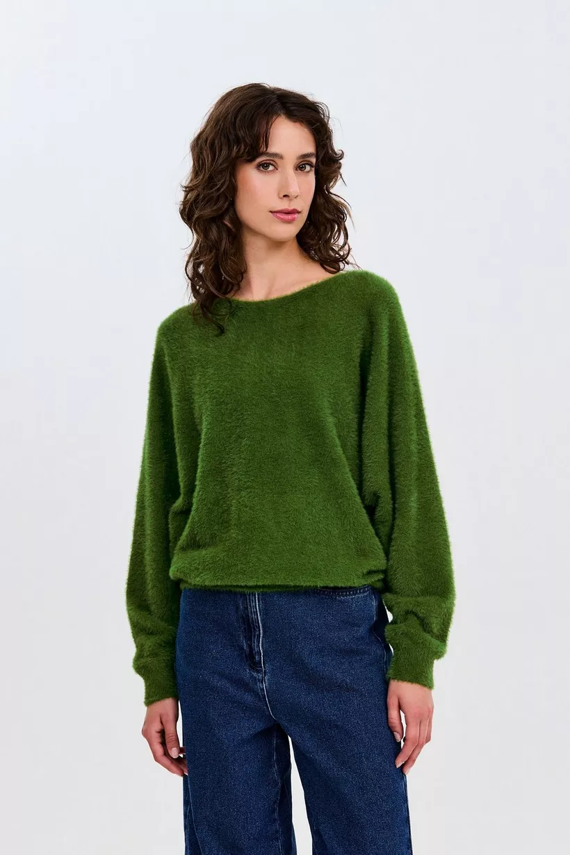 Een zachte trui waar je je deze herfst en winter non stop in wilt hullen? Say no more! Deze groene, zachte damestrui heeft een harige textuur, een uitgesneden neklijn en vleermuismouwen voor een nonchalante look.