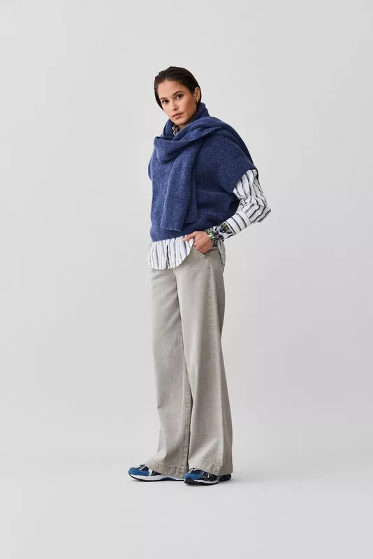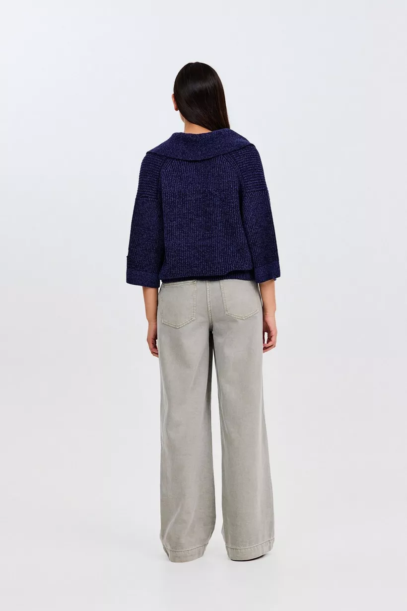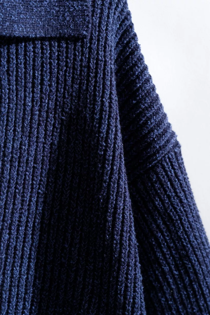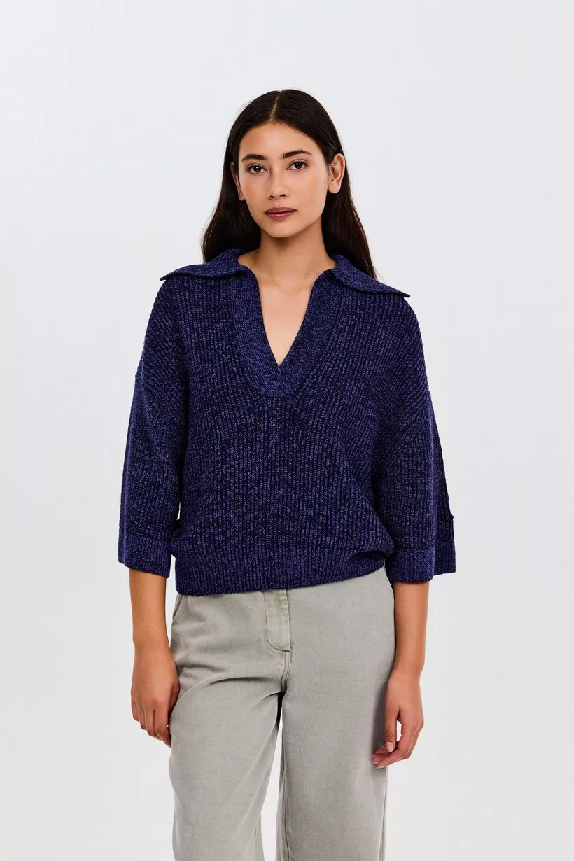 Fan van de polo-trend? Deze donkerblauwe, gebreide trui voor dames is een must in je herfst- en wintergarderobe! Dit item heeft halflange, wijde mouwen, een opvallende polo-kraag en een V-hals voor een relaxte look.