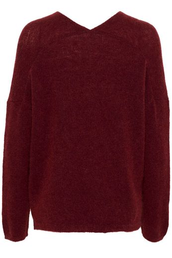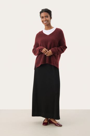The model is 174 cm tall and wears a size M. This soft knit in a deep burgundy shade features a relaxed fit